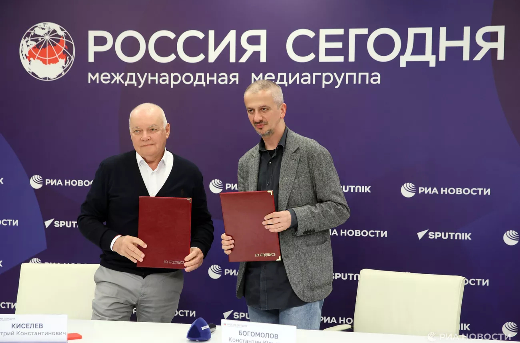 Фото: Константин Богомолов (справа) и пропагандист Дмитрий Киселев / РИА «Новости»